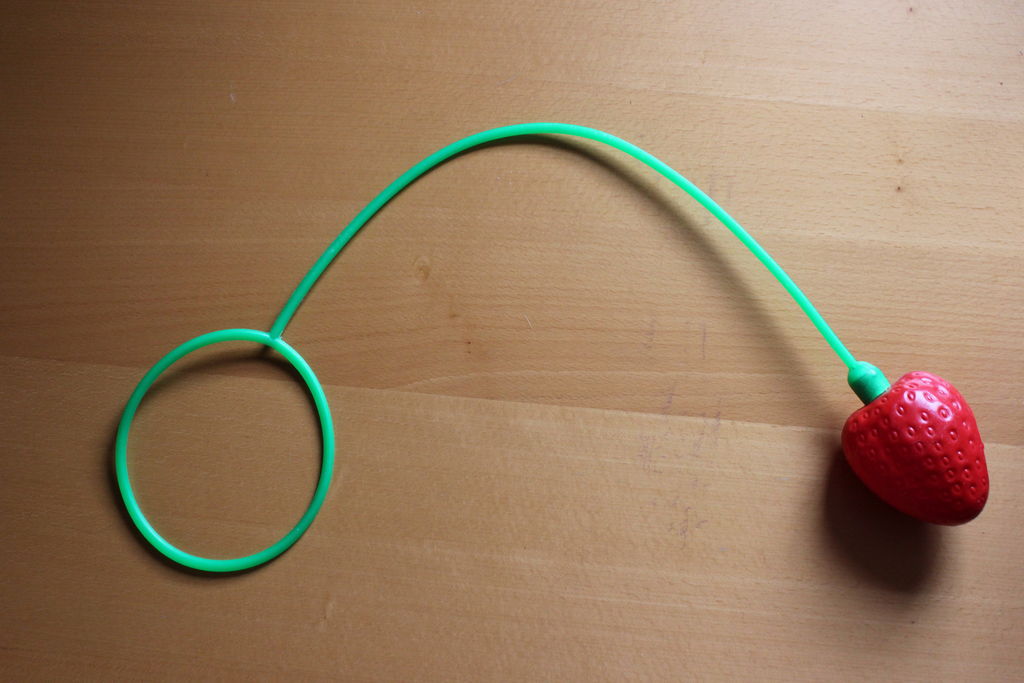 What I got was a Skip-It, a toy that the internet tells me was all the rage in the ‘90s. It’s essentially a length of rubber with a loop on one end and a weight on the other. You put the loop over one ankle, swing the weight around in a circle, and jump over it with your other foot. The original version from the ‘60s was called The Lemon, because, rather logically, the weight was lemon shaped. I must have gotten a knock-off, because the weight on mine was strawberry shaped.