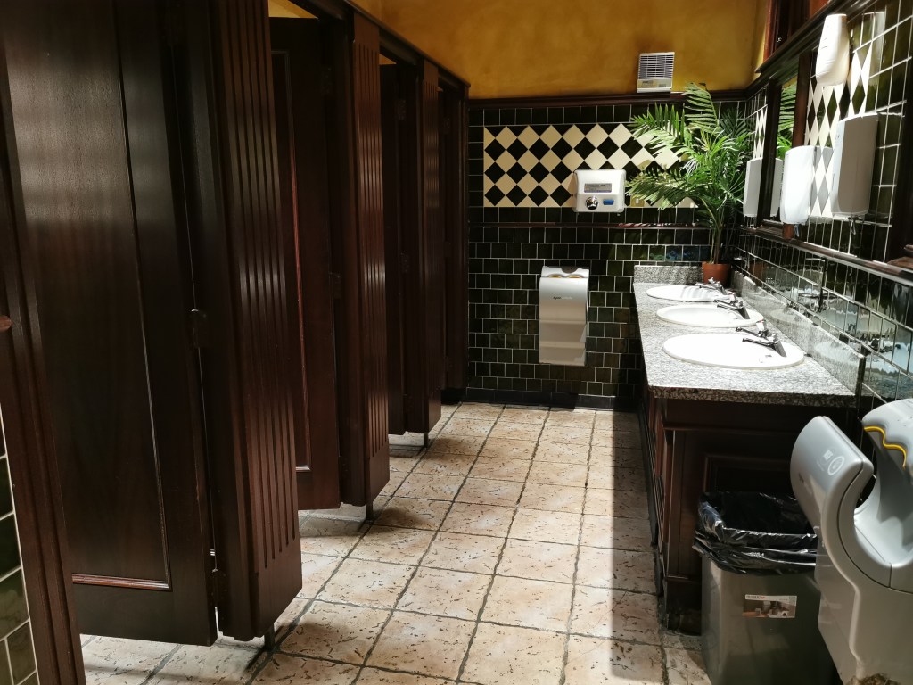 The Library of Congress had a beautiful washroom: marble everywhere; brass fixtures. I wish I’d taken a picture. And the Bay in downtown Winnipeg, mezzanine level, had a massive washroom that was a throwback in time. It had an area with counters, stools, and lit mirrors so ladies could redo their makeup. A threeway mirror to check one’s outfit. And a couch, presumably for fainting on. The toilets were tucked away discretely at the back. By our era it was pretty run down but you could feel the history of it. Most it’s blocked off now, if it’s even open anymore.
