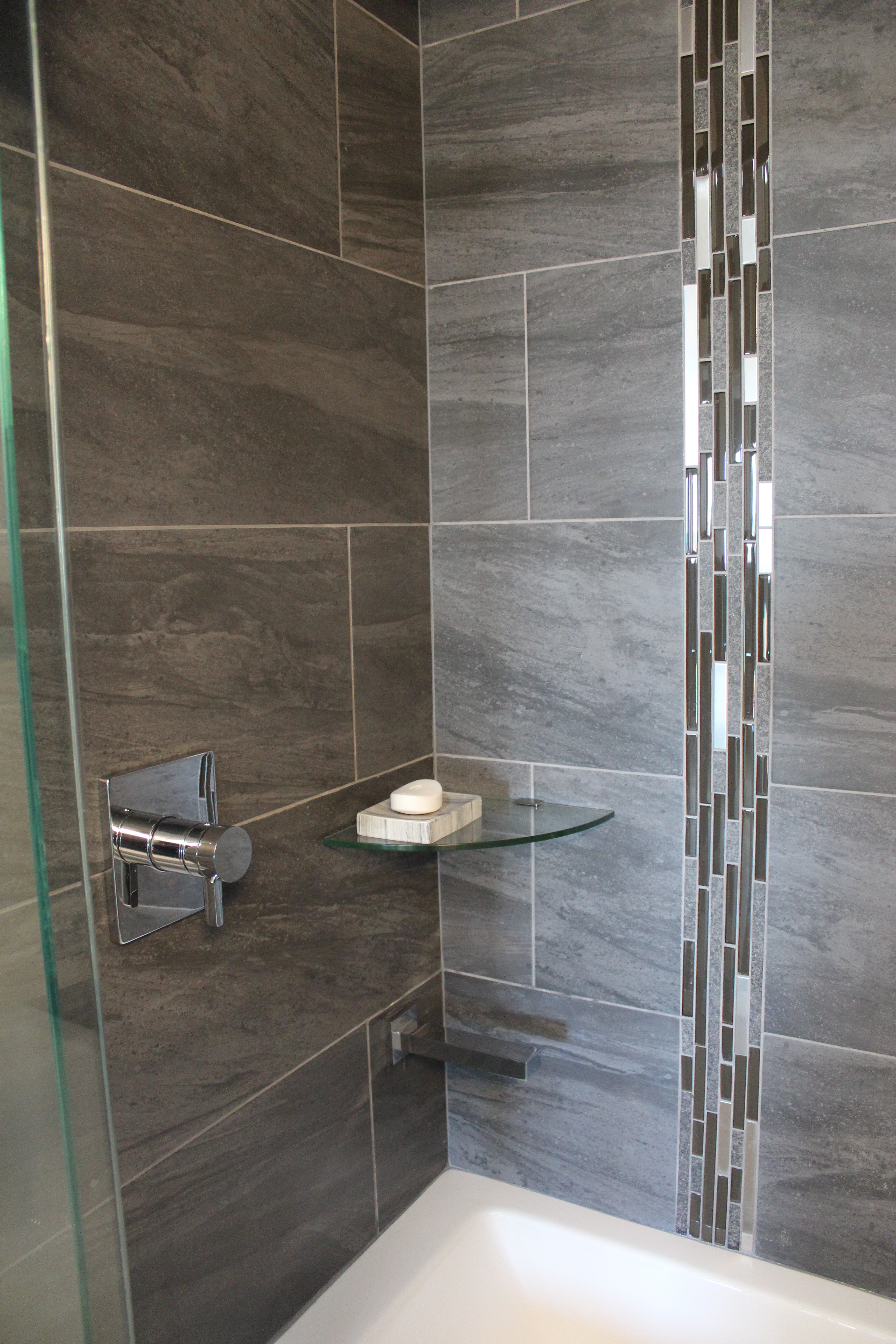 All of this has led me to try my own hand at restroom design. Going for a high end hotel vibe, I tore out the original, dingy, dated one from the ’70s in my house and replaced it with this: