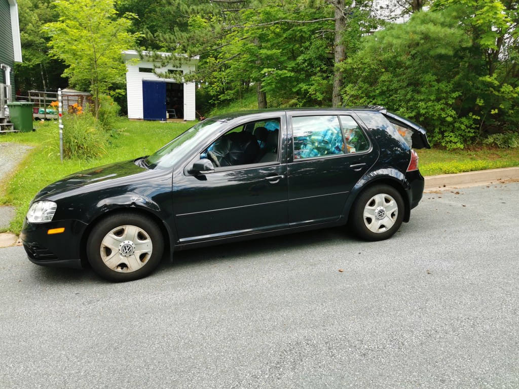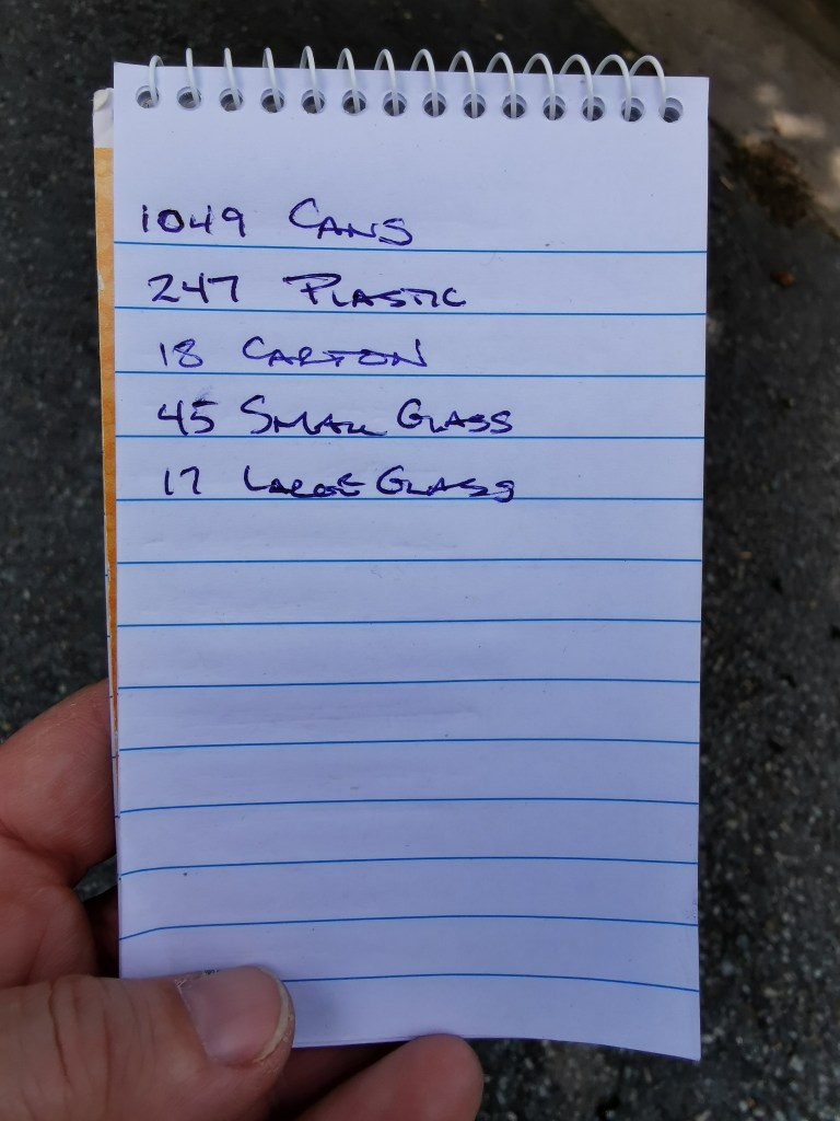 It wasn’t until a couple of years after moving here that I learned any beverage container for which one pays a deposit fee at time of purchase can be turned in at a recycling depot, and half the deposit amount get refunded. For the most part, that means recouping 5¢ apiece. And while I do my best to avoid single-use drinks containers – I buy beer in growlers when available, rarely drink pop, bring water from home in a thermos – they still add up. So I store them in the shed, and a couple of times a year, this happens: