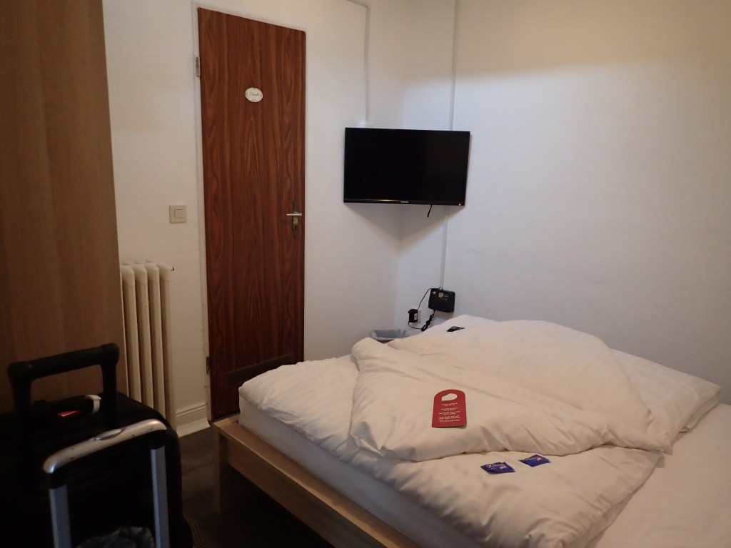 The room itself wasn’t much better. The bed took up nearly all the available floor space. I had to sidle around it, it was so close to the walls, and the bathroom door would only open about a foot before it hit bed frame. Although there was technically enough space for our luggage … so long as we didn’t want to occupy the floor at the same time.