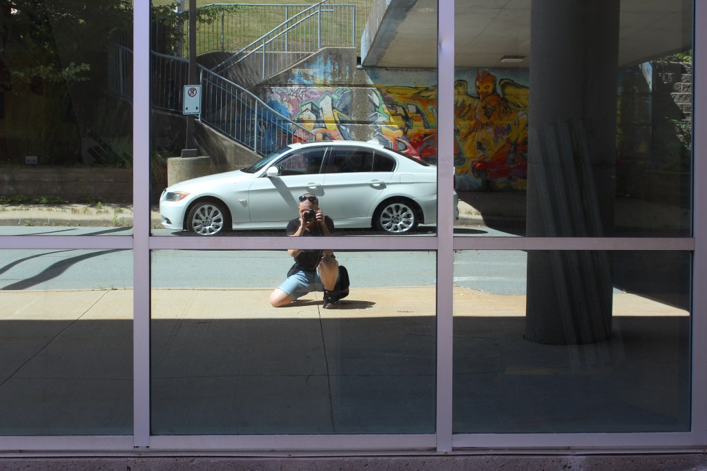 He stands by his word, though, as he spent the weeks since the car arrived getting it both road worthy and pretty. Today it was deemed ready, and we went for a drive around town, looking for interesting spots to pose the car. Which turned out to be a learning experience about the city we’ve both lived in for decades, as we found a mural we’d never seen before …