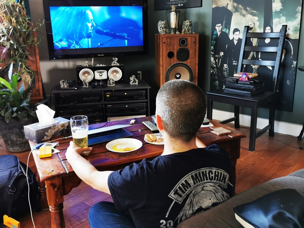 That’s how, after a very long night shift and a very short sleep, I found myself having beer and cheese for breakfast – sorry Tim, but I just can’t do wine – sitting on the living room floor in my concert t-shirt, watching my first ever live stream show.