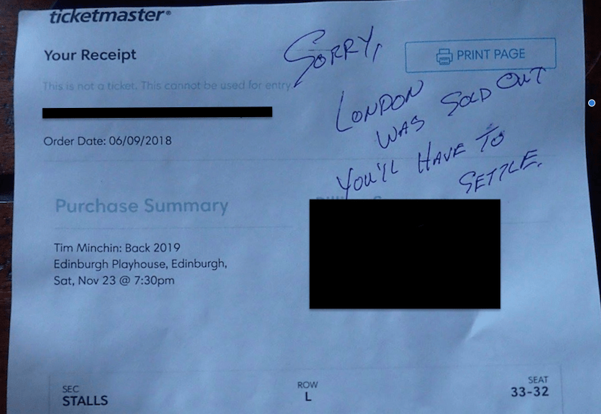 Yep. Ron had told his boss he’d be late, and gone on Ticketmaster the minute tickets went on sale. At one point, he had four separate windows open, moving farther afield from London when he realized that wasn’t going to happen, eventually getting seats in Edinburgh. Excellent ones.