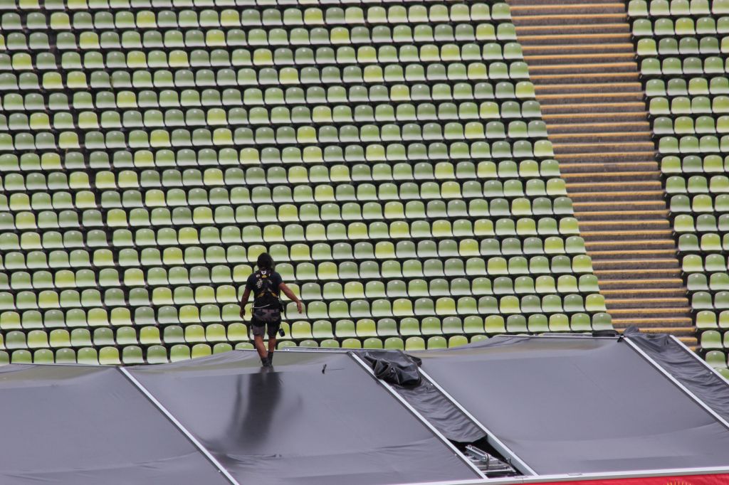 The grounds surrounding the actual stadium are covered with huge glass and steel canopies that were supposed to imitate the Alps, look kind of like tents, and put me in mind of trying to secure a tarp on a windy day. The canopies also ring half of the stadium proper, tying the whole grounds together thematically.