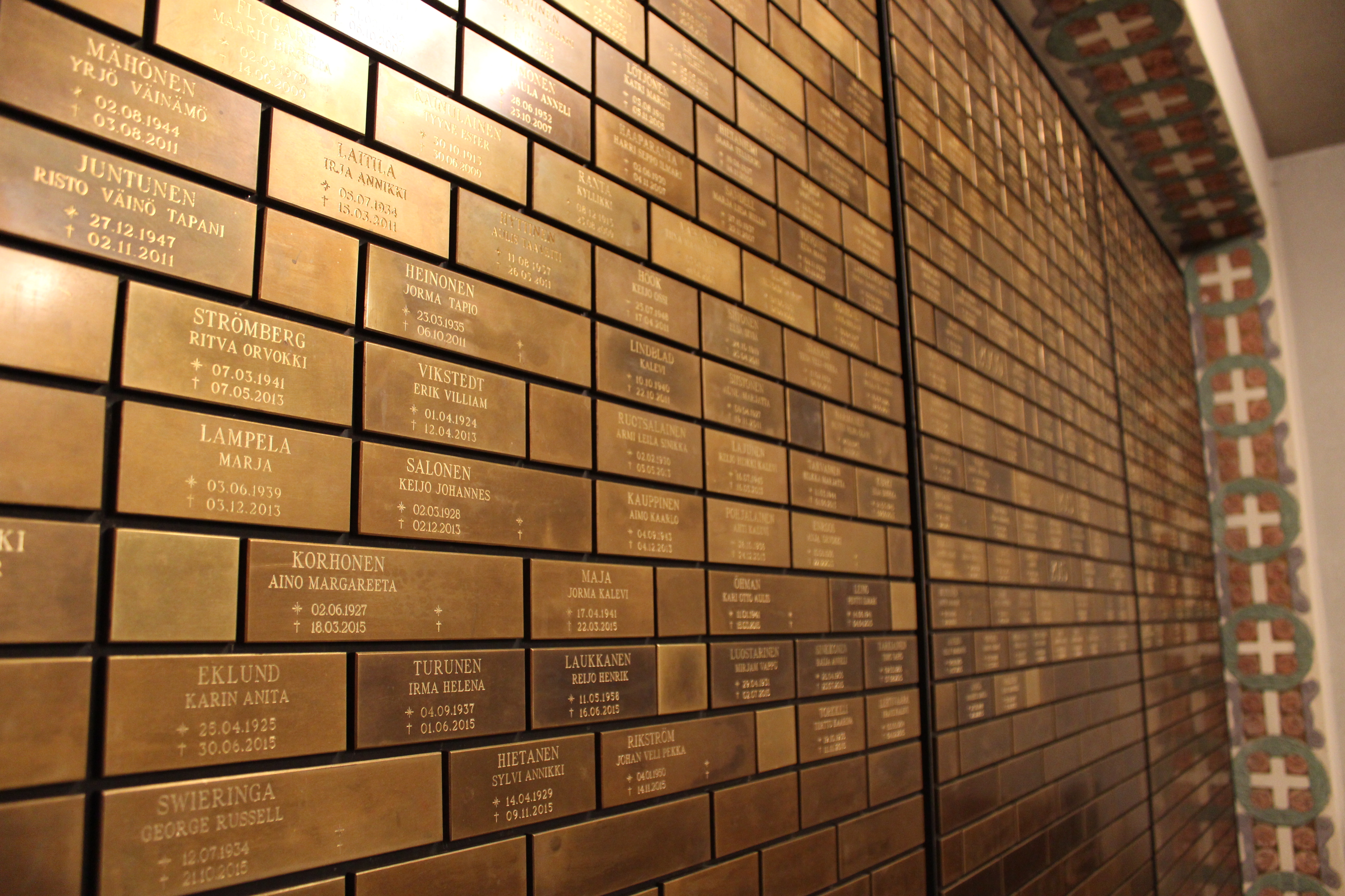 Kallio was a stumble-upon find, something looming at the end of a street I needed to cross to get wherever I was going. Of course I immediately took a detour. It was well worth it. I found some of the artwork and lighting quite beautiful, and a mosaic wall of small brass plaques engraved with parishioner names and the dates of their births and deaths was genuinely interesting.